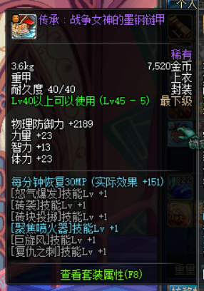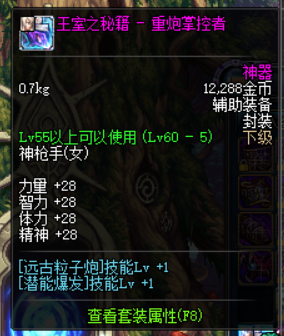 对于大枪来说,需要一身的异界3散件用来增加潜能爆发的伤害,除去上衣(控魂女神的纹钢胸甲)、左槽(王室之秘籍)、武器(奇迹之巨龙手炮)。经过挖坟,上古大佬计算后碎片9所加的伤害远不及一身散件,因此大枪玩家需要注意,所送的45传承套装一定要保留!一定要保留!保留!去土罐处购买设计图升级至55级传承。
