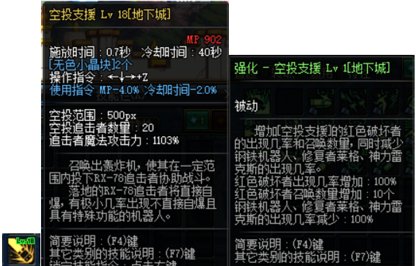 机械的标志性技能,没有之一,一个比较完美的副C技能,在前期甚至是主力输出技能,压制控场输出的大型AOE技能,有一定的机动性,技能动画华丽很有压迫感,点了EX空投后,只会投下红色小地瓜。前期刷白图&深渊&异界远古图1的开场技能(清理真野猪1图和3图效率极高)。缺点CD略长,会触发无色感应,出伤较慢需要提前释放;当输出不足时,放空投等到满地红色小地瓜后再放出大地瓜和超大地瓜进行定点爆破补充爆发伤害和压制效果。鉴定为夯。