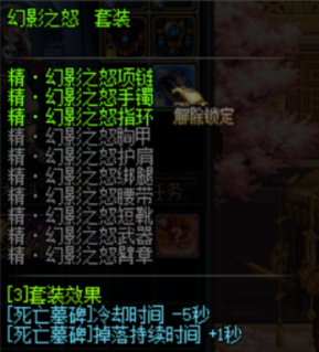 也是加冥炎,但是不同于黑魂,这一套减持续时间(没错,减少),当然cd减的更多,也就是能更频繁的释放冥炎解放三刀,还是那句话,没18武器别玩。3件套和6件套只加成固伤部分,可以和黑魂搭配。