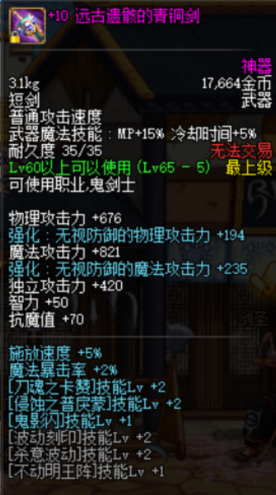 红阵,鬼剑士通用buff,鬼泣的也没什么特殊之处,不过是数值更高,可以提供四百多的智力加成,在有时间的情况下可以放一放,优先级远低于绿阵,不需要专门换装,远古遗骸的青铜剑加2级红阵,换装放绿阵的时候顺便放一下就行了。鉴定为NPC。