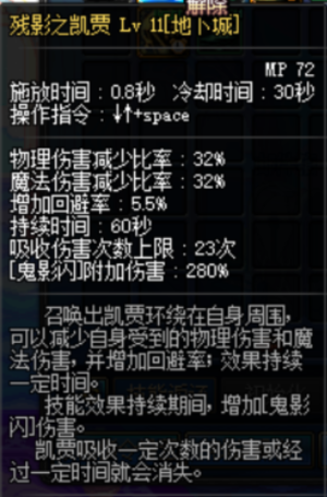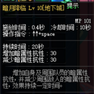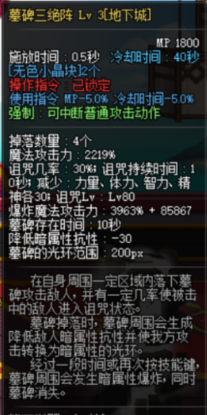 应该是全游最强减防技能,如图,提供高额的减魔防、物防(辅助是不可能辅助的)、异常抗性,毫无疑问也是鬼泣时装技能的不二之选。不同于剑魂的斩铁等需要攻击才能赋予的减防效果,场地技能只要怪在圈里面就会受到效果,因此可以在不触发怪物受击机制的情况下生效,是鬼泣秒杀各路boss不可或缺的一环。绿阵的效果具体来说有多强呢,剑魂上满buff再开宠物技能的太刀剑舞,伤害不如不上任何自己的buff只让鬼泣出来放个绿阵高(笑)。我知道很多新手鬼泣有强迫症,要把所有鬼阵和暗月放完才开始输出,相信我完全没必要,大部分时候一个绿阵就够了。鉴定为夯。