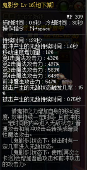 状态类技能,吃cd药的情况下cd与持续时间持平,大大增强鬼泣的续航能力,改变普攻以及跳x的模式,附加冥炎伤害,冥炎击中怪物还能留在怪物身上造成灼伤伤害,灼伤伤害无视防御,在虚无2鹰犬2等高防boss有奇效,另外需要打连击的场合也很好用,冥炎是随动,无非通过换装提升伤害。再次施放可以直接结束冥炎状态并施放冥炎剑(俗称三刀),三刀为纯百分比伤害,伤害一般,范围小且动画较慢,不如更灵活的三剑击和鬼影鞭,一般不推荐释放。鉴定为顶级。